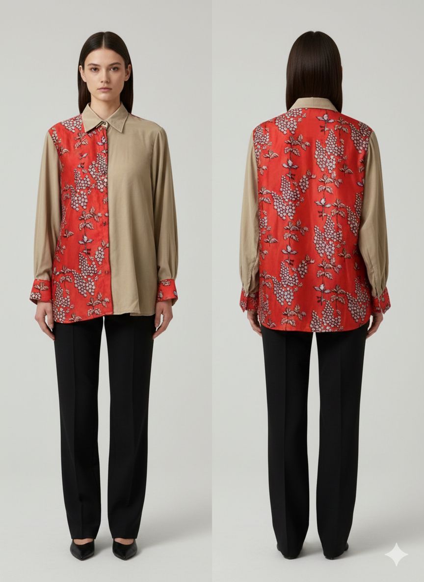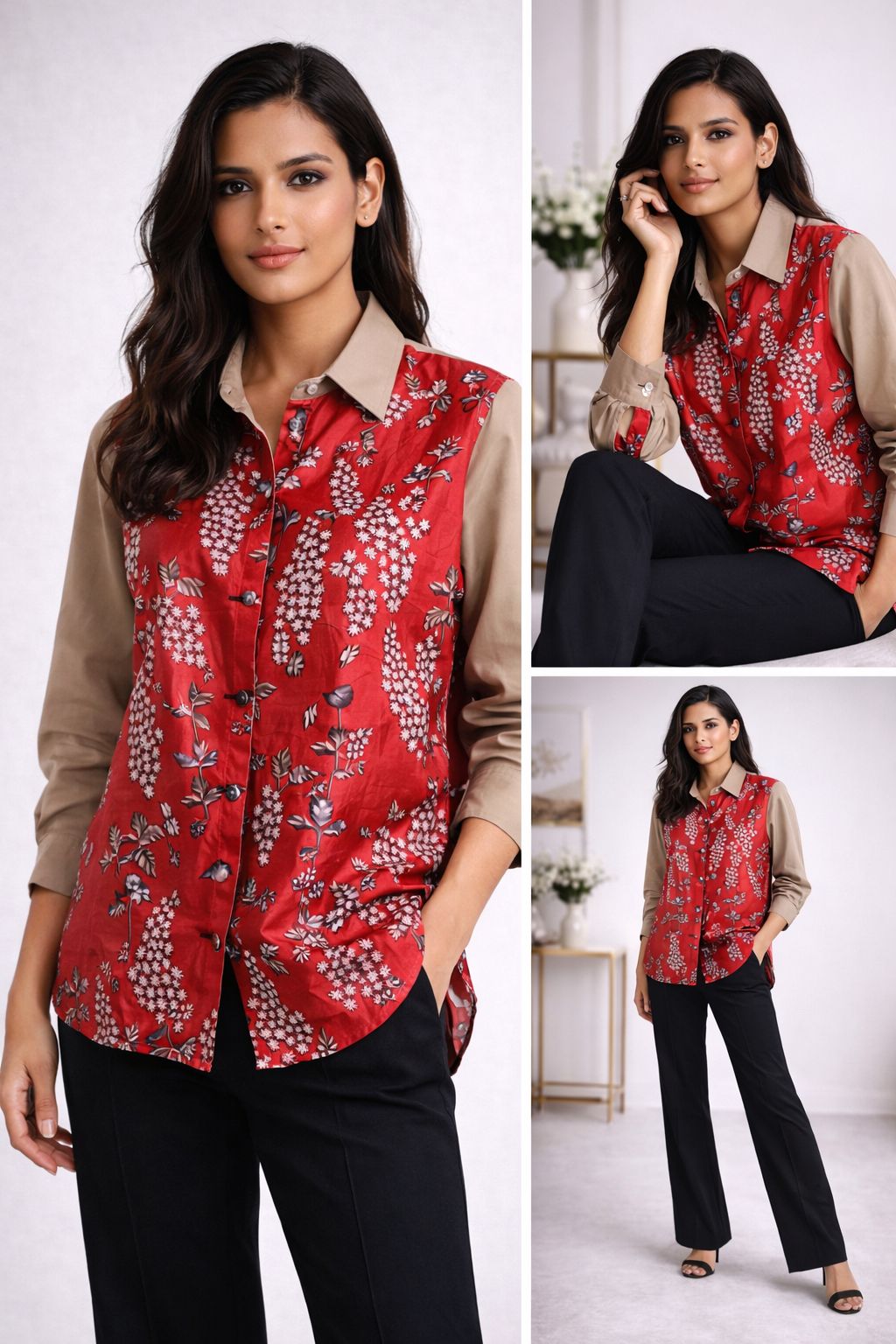 A refined expression of modern elegance, the Crimson Noir Shirt is crafted from a luxurious velvet-touch fabric that delivers a soft, rich, and indulgent feel. Designed with a bold crimson floral statement panel, beautifully contrasted by warm beige sleeves and a matching collar, this shirt showcases depth, texture, and refined sophistication. Perfectly suited for elevated daytime styling or seamless evening transitions, it offers a standout look with effortless versatility and timeless appeal.