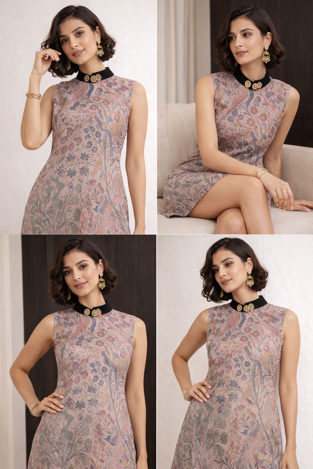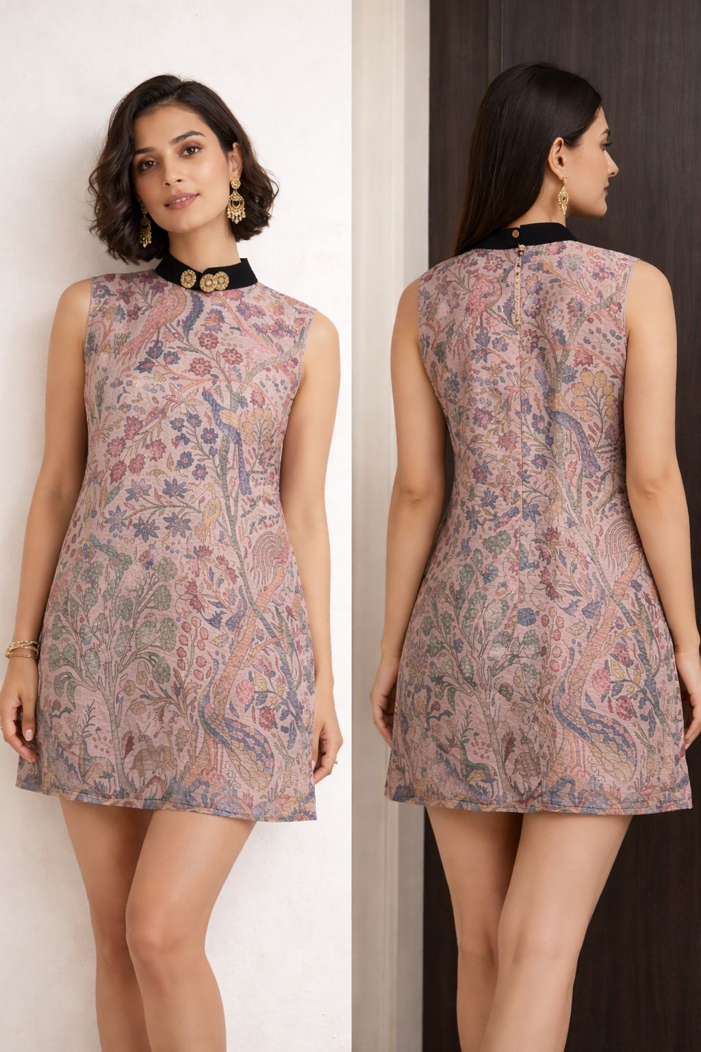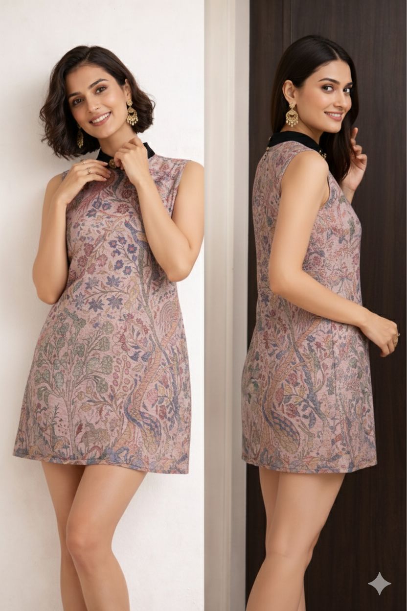 Designed for the modern, sophisticated woman, this printed sleeveless dress showcases an intricate nature-inspired motif in soft, refined tones, offering a graceful and elevated aesthetic. The contemporary silhouette is enhanced with a contrasting high neckline adorned with subtle ornamental detailing, adding a touch of understated luxury. Tailored to provide a structured yet comfortable fit, the dress is finished with a smooth, seamless back for a polished and effortlessly refined look. Versatile and timeless, it transitions beautifully from elevated daytime styling to intimate gatherings and chic evening occasions.