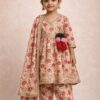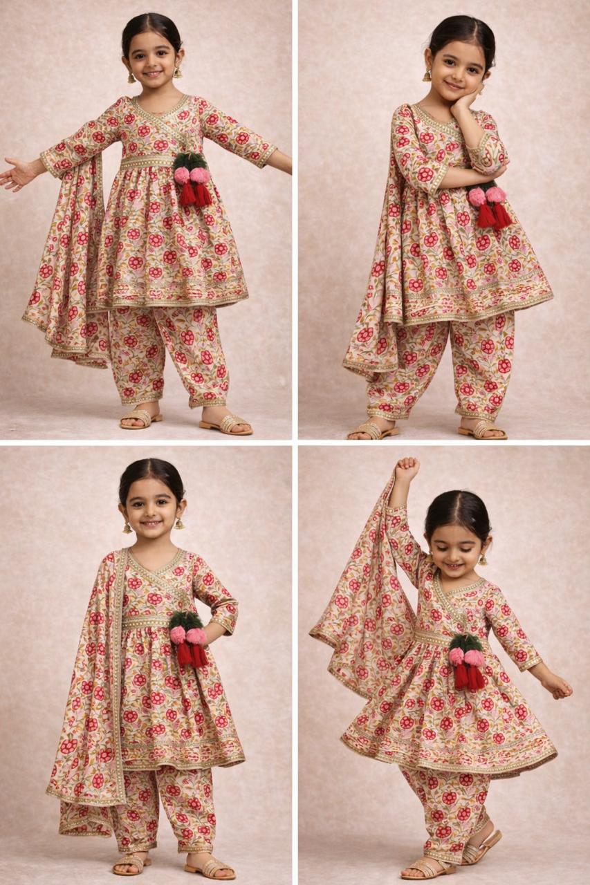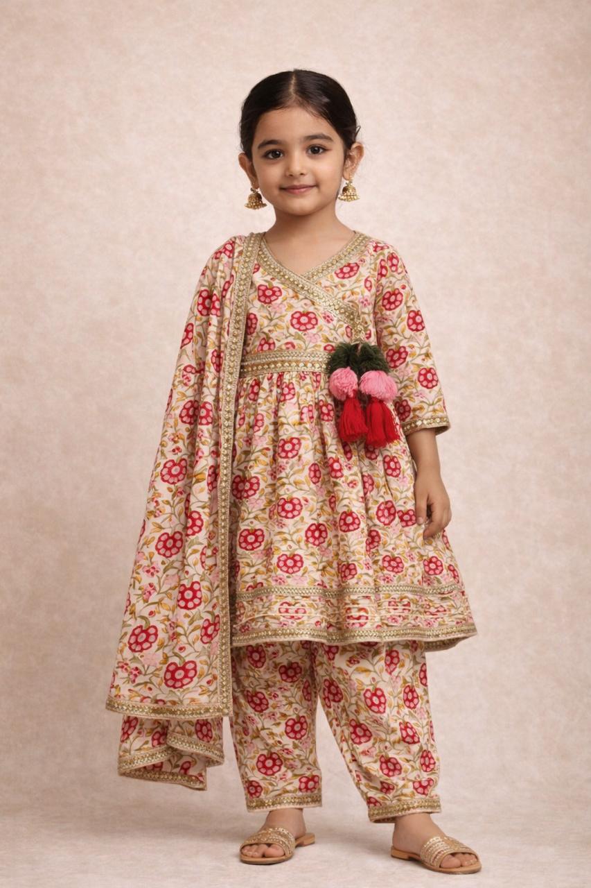 This charming ethnic co-ord set for little girls brings together elegance, comfort, and festive beauty. Crafted in a graceful floral print, the flared kurti features exquisite gota lace detailing and cute tassel accents that add a playful traditional touch. It is paired with comfy matching bottoms and a coordinating dupatta to complete the look. Lightweight, stylish, and easy to wear, this outfit ensures effortless movement and all-day comfort, making it perfect for weddings, festivals, family celebrations, and special occasions.